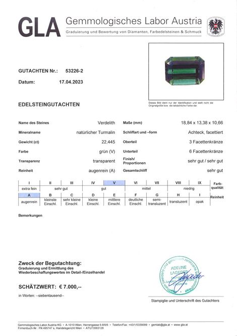 Aktuell erstelltes GLA Edelsteingutachten mit bestätigtem Wiederbeschaffungswert in Höhe von € 7.000,- wird beigestellt.